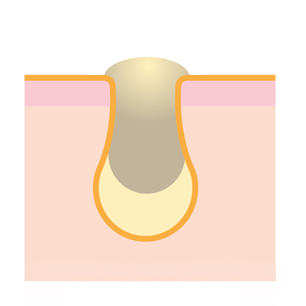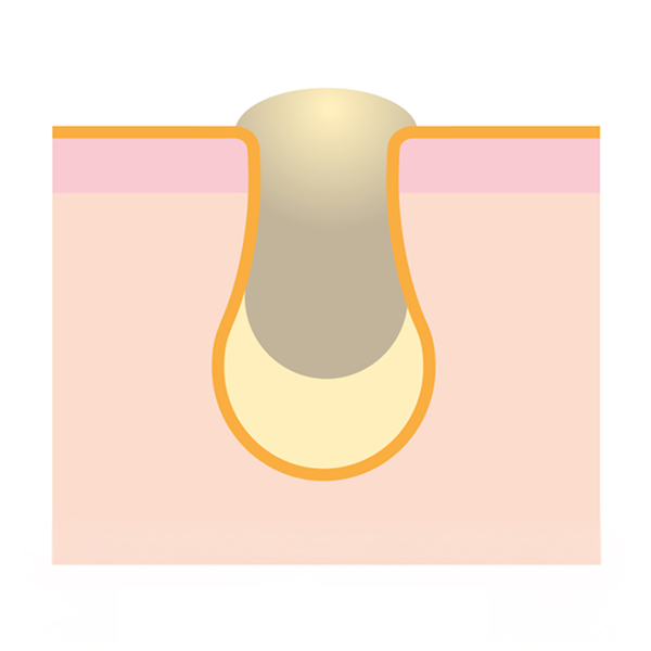 このタイプは、 ニキビの強い炎症が肌の最も深い層である真皮層や皮下組織にまで達してしまった結果生じます。 くぼみの入り口が非常に狭いのに対して、深さが真皮層の奥深くまで及んでいるため、ニキビ跡の中でも特に治療の難易度が高いとされています。 -